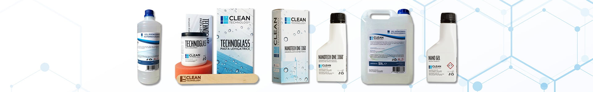 Naše podjetje je ekskluzivni uvoznik izdelkov italijanskega proizvajalca CLEAN TECHNOLOGY, ki je specializirano za nanotehnološko obdelavo in dolgotrajno zaščito stekla ter keramike. Razvoj pri uporabi teh materialov v sodobni arhitekturi je namreč vzpodbudil različne raziskave na tem področju, velik napredek pa se je pokazal predvsem pri nanotehnologiji. Podjetje CLEAN TECHNOLOGY razvija trenutno najboljše, dogotrajno obstojne hidrofobne nano premaze, polirna sredstva in čistila za stekla ter keramiko na tržišču.